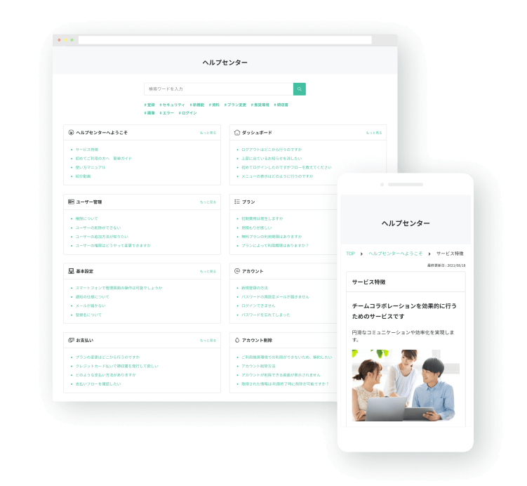 よくある質問やヘルプページを手軽に構築。社内向けマニュアルやナレッジベースの作成にも。自己解決率をあげ問い合わせ数削減に。
